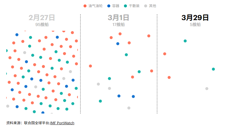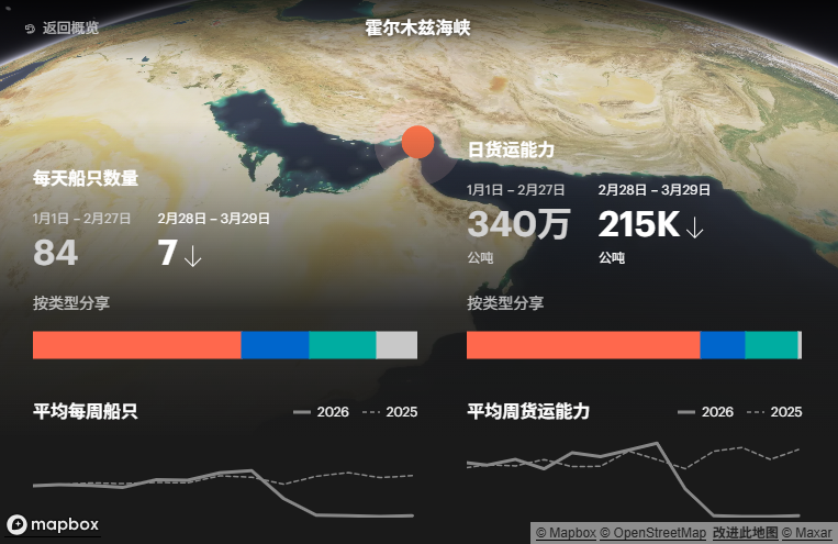 霍尔木兹海峡的原油和石油输出量从战前约每天2000万桶骤降至目前微弱的涓滴。由于交通基本停滞,绕过关键水道的能力有限,且库存已满,海湾国家已将总石油产量大幅削减。如果航运仍然无法迅速恢复,供应损失将会增加。
